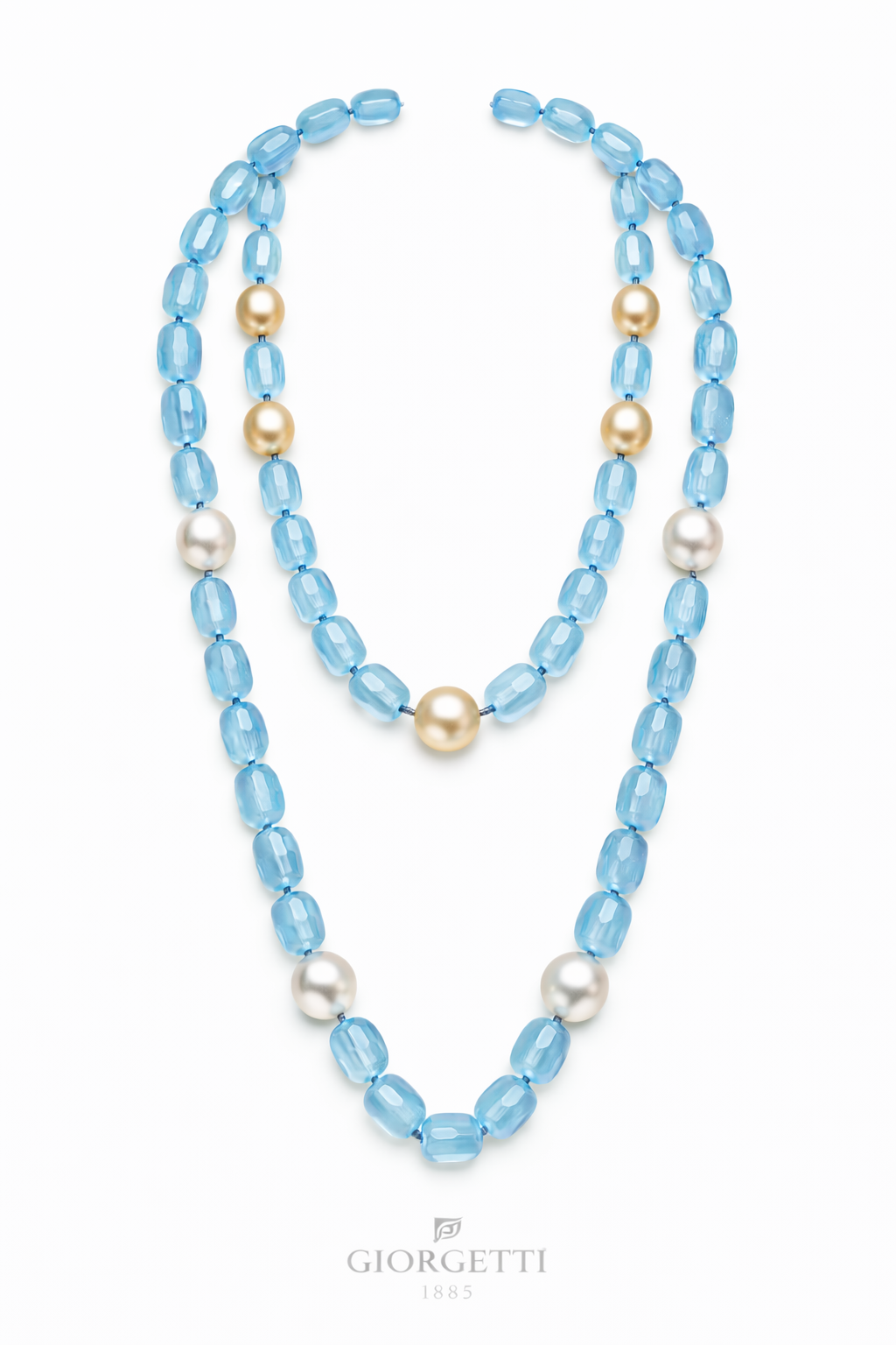 عقد فاخر مزدوج من الأكوامارين الطبيعي مع لآلئ بحر الجنوب الذهبية والبيضاء بقطر 13–15 مم. تصميم إيطالي فاخر مع مشبك من الذهب الوردي عيار 18 قيراط. قطعة مجوهرات راقية تجمع بين الأكوامارين المقطّع واللآلئ الأصلية عالية الجودة من دار جورجيتي 1885.