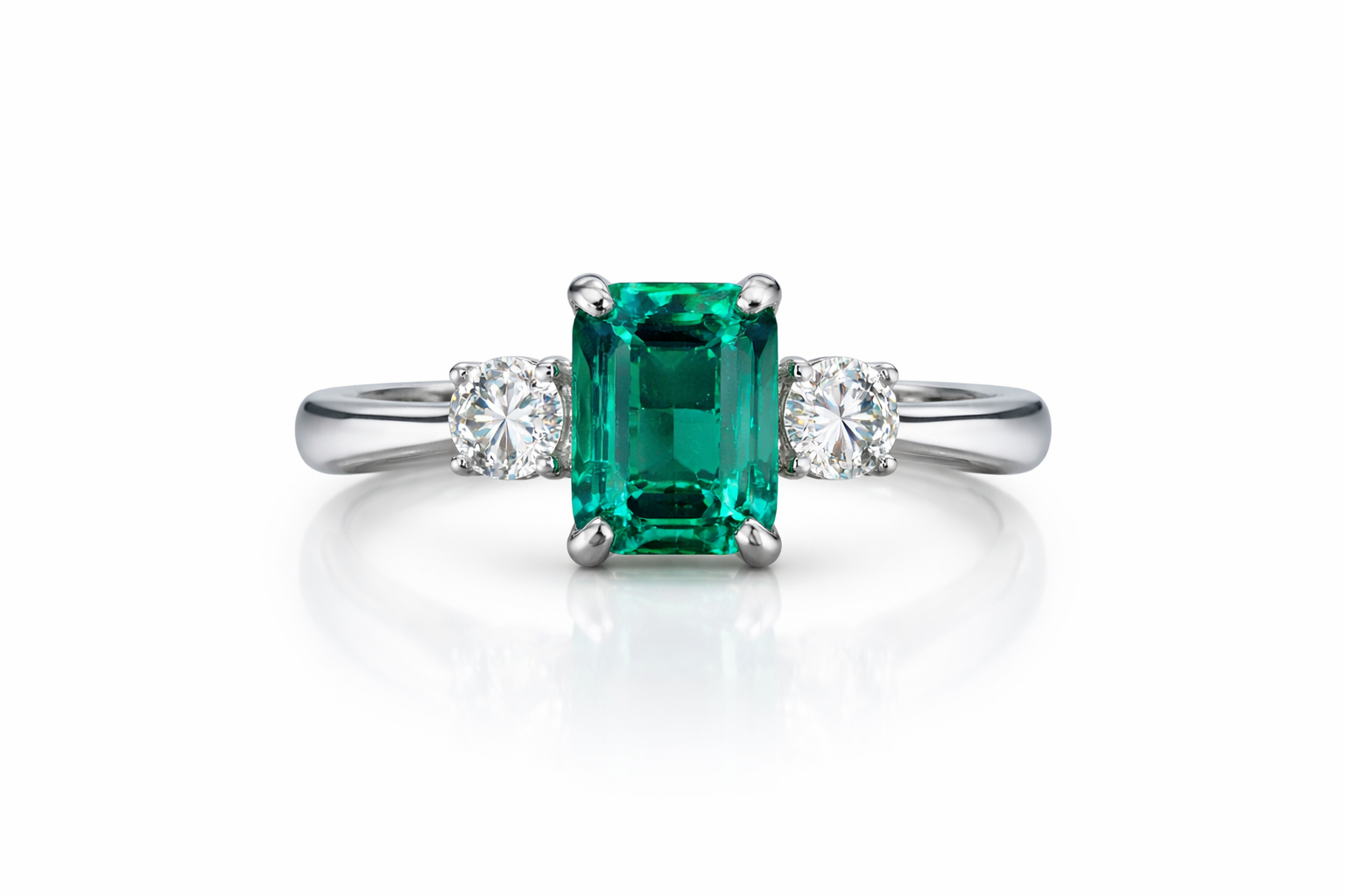 Elegant and timeless, this refined three-stone ring features a striking emerald-cut green gemstone set at the center, secured by four delicate prongs that enhance its clean, geometric lines. Flanked by two brilliant round-cut diamonds, the design offers a perfect balance of vibrant color and radiant sparkle.