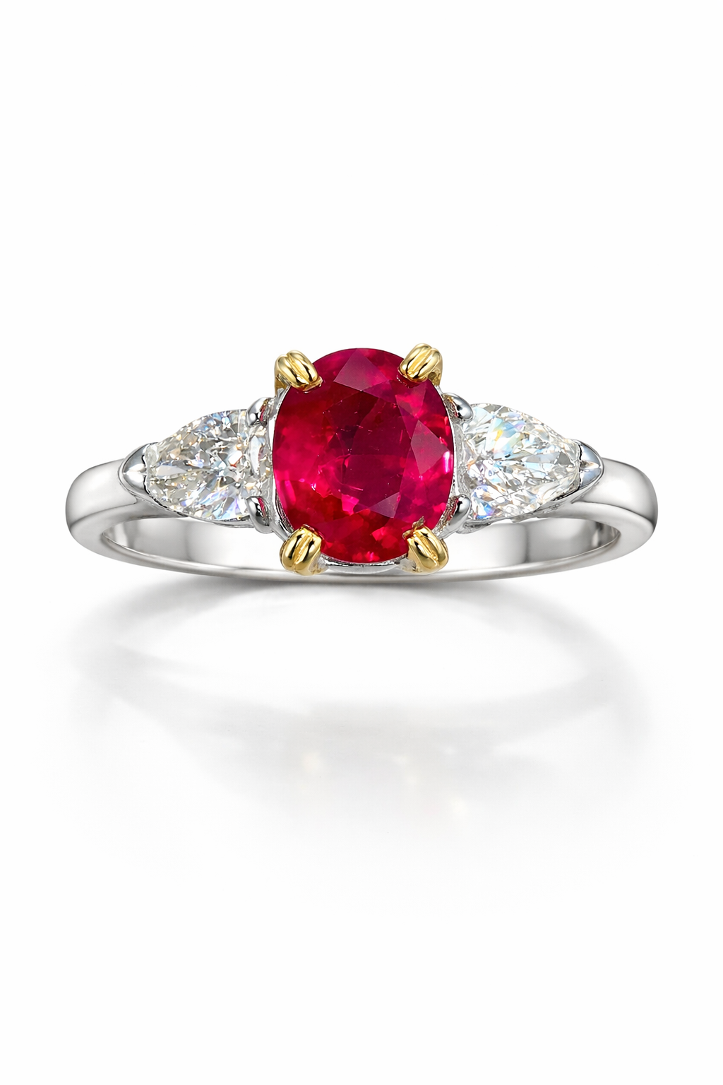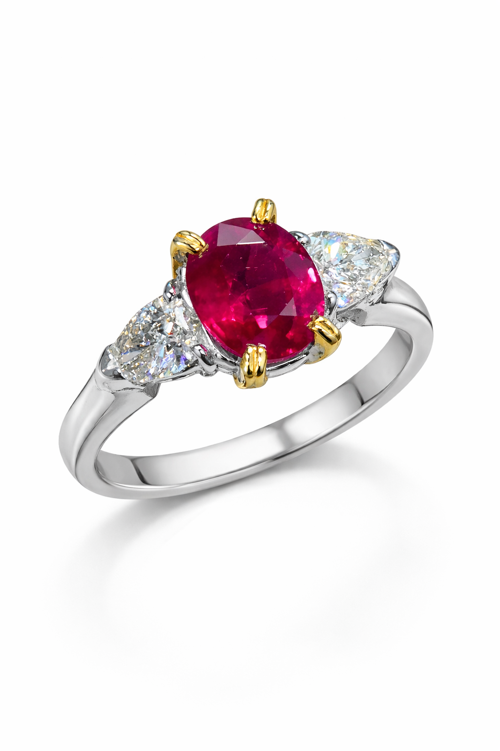 La montatura in oro bianco 18Kt esalta la purezza del design, mentre le griffe in oro giallo 18Kt incorniciano il rubino con un raffinato contrasto cromatico, firma distintiva della creazione.
